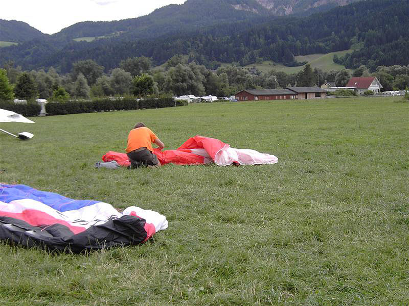 De ochtend begon vandaag iets later dan gebruikelijk omdat waarschijnlijk de vermoeidheid wat toe begint te slaan. Toch waren we op tijd uit de tent en waren de eerste piloten al aan het vliegen. Wederom waren ze vroeg aan de slag gegaan. Na het 20.000 calorieën ontbijt en ettelijke bakken koffie (voor mij) heb ik de heren zover gekregen om aan de slag te gaan met mijn vliegeritus en zijn we naar de Embergeralm getogen. Ook Marianne is mee naar boven gegaan. Hierdoor moest Jasper helaas een busje later nemen en kon hij niet naast Schumi in het busje zitten. Boven op de 1100 meter was het redelijk rustig en zijn we gelijk uit gaan pakken. Jasper heeft even rust genomen om de haarspeldbochten te verwerken en is niet meegegaan. Jeffrey, Gerard en ik zijn gestart en helaas mistte Gerard de bel. Jeffrey en ik zijn aardig blijven hangen en hebben een tijdje boven de start gevlogen. Kijk, dit zijn vluchtjes waar de vliegeritus eindelijk wat mee onder controle kan komen!!! Gelijk ingepakt, broodje gegeten en meteen naar boven. Daar stond Jasper al klaar en is gelijk gestart. Jeffrey, Gerard en ik zijn gelijk gaan uitpakken en ook snel gestart. Voor ons niet de beste keus, bleek naderhand, want we konden niet boven blijven. Voor Jeffrey echter wel. Hij heeft de bel wel te pakken genomen en steeg mooi boven de Emberger uit. Daarna is hij doorgevlogen naar de Wiesflecker en Steinfeld, en kwam daar mooi hoog aan. Uiteindelijk heeft ie een uur gevlogen. Hierna werd het aardig donker en hebben we besloten een geländebier te nemen en te gaan zwemmen. Helaas brak het weer open en werd er volop gevlogen. Wij zijn beneden gebleven en hebben nog boodschappen gedaan.